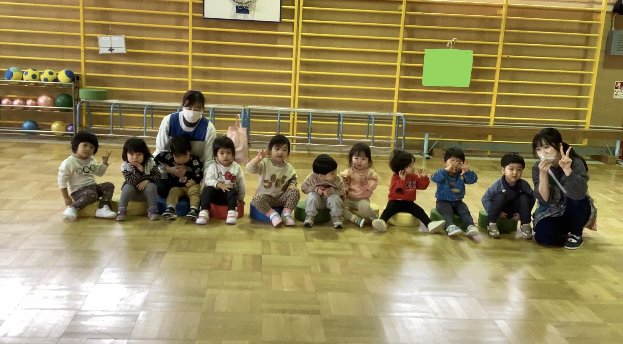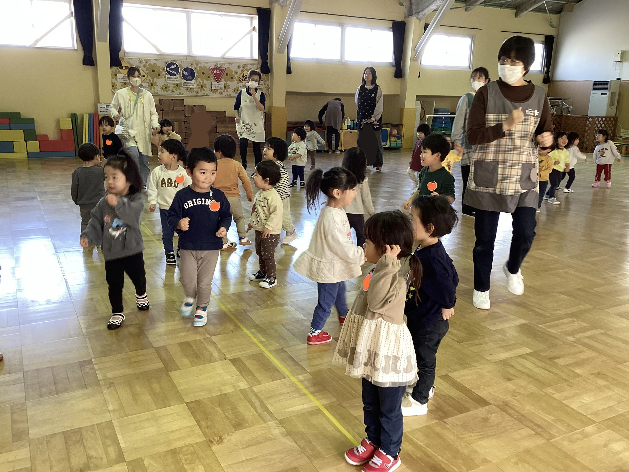 幼稚園のホールでは、子どもたちの大好きな体操を踊ってノリノリでした♪