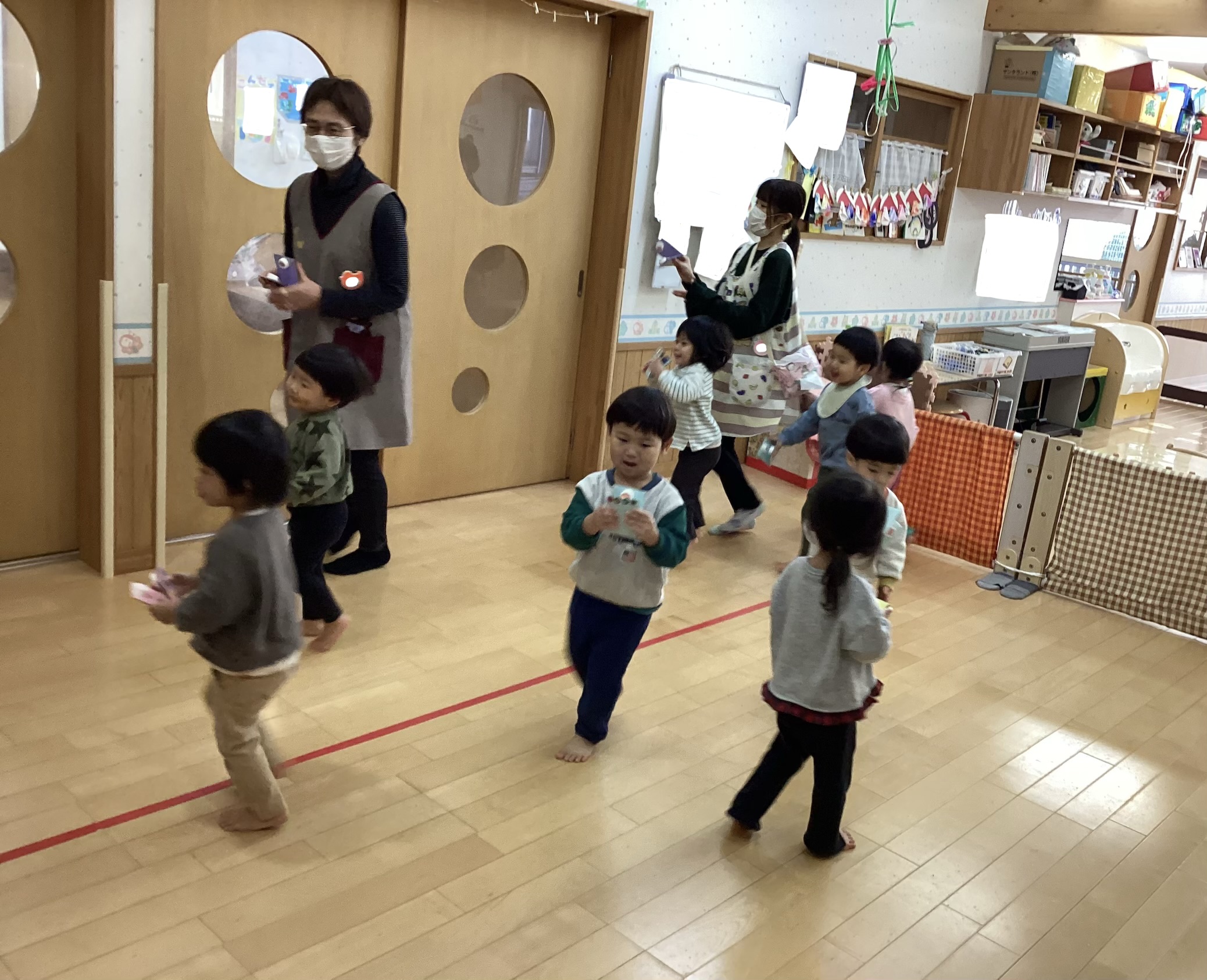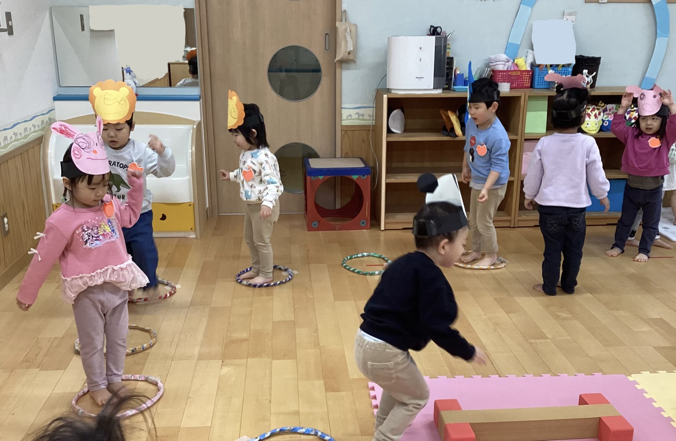 親子なかよし会の前は、動物のおめんをかぶってたくさん運動遊びを楽しみました。