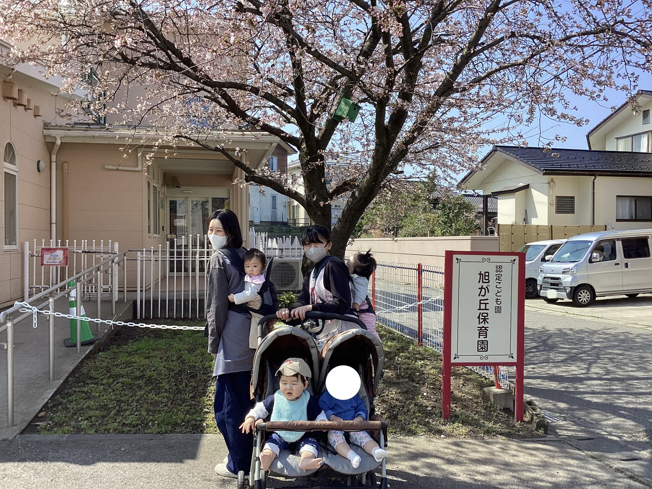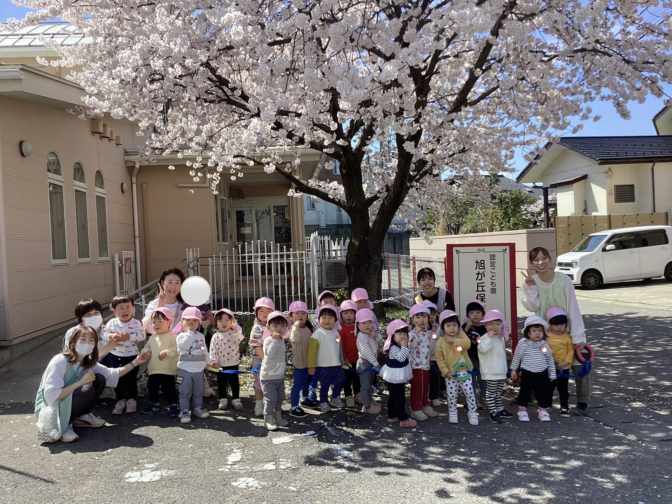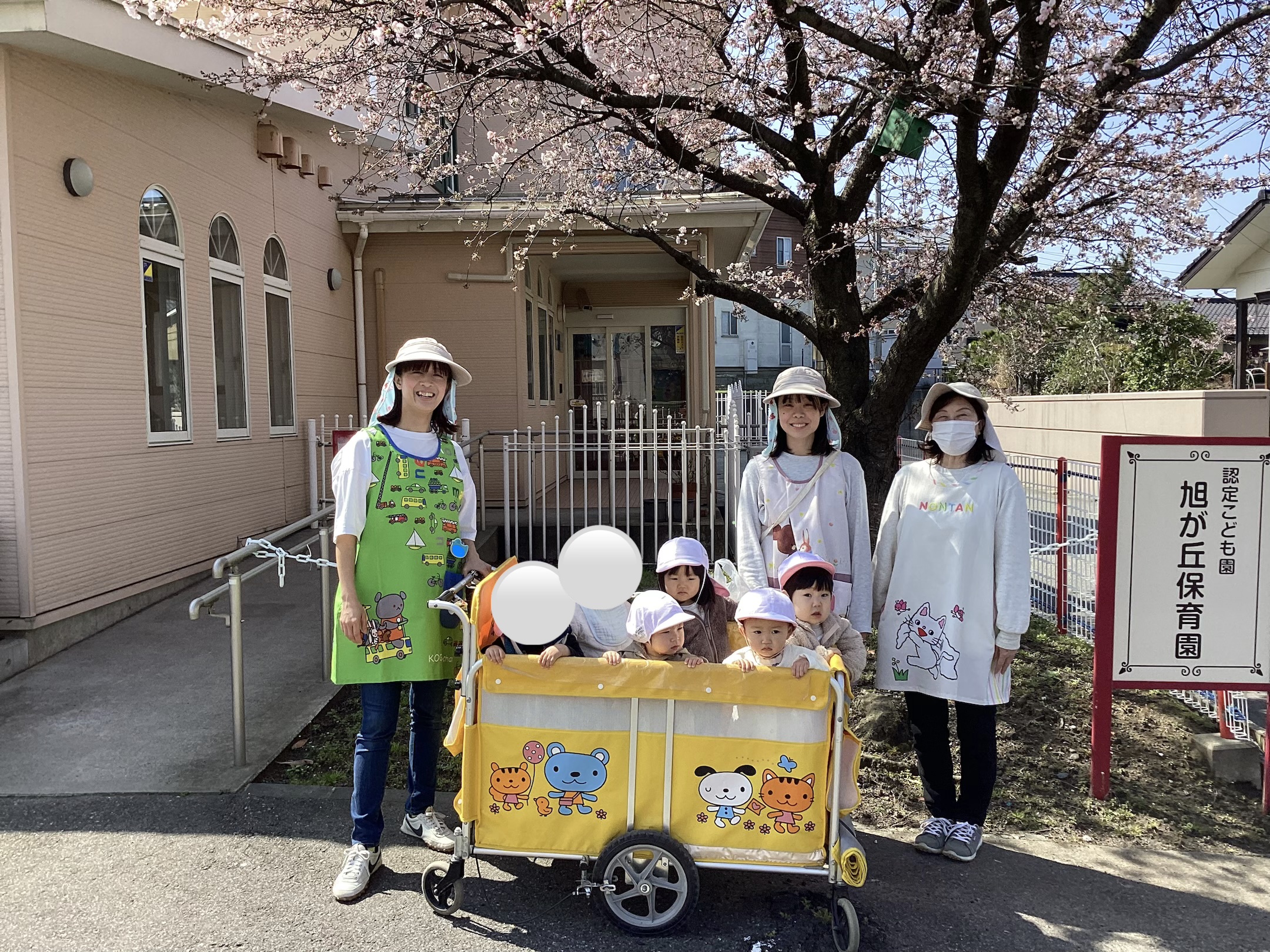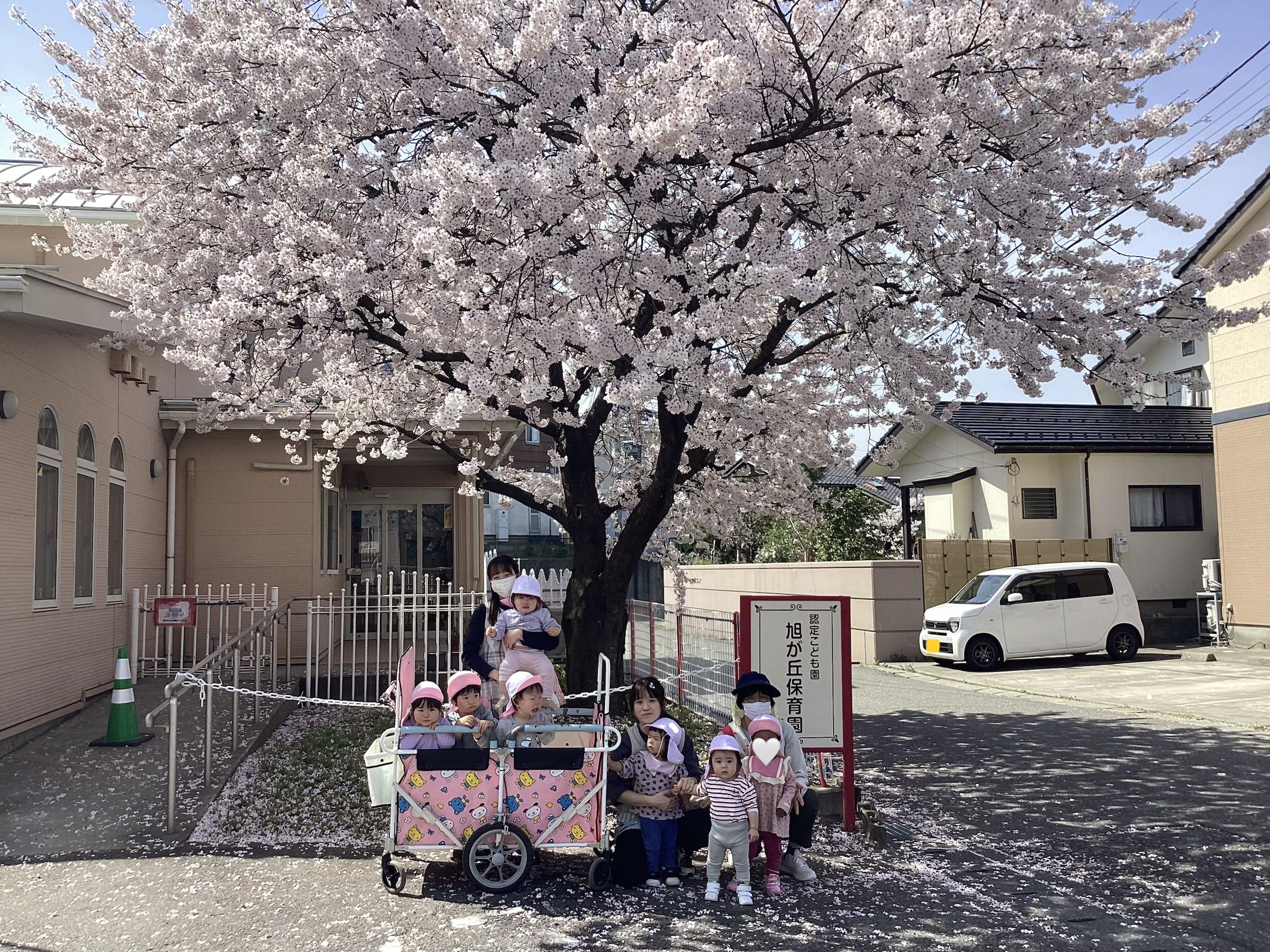 満開の桜の下で写真をパシャリ♪桜を見て指をさしたり、ご機嫌でお散歩を楽しんだり、お外大好きな子どもたちです!