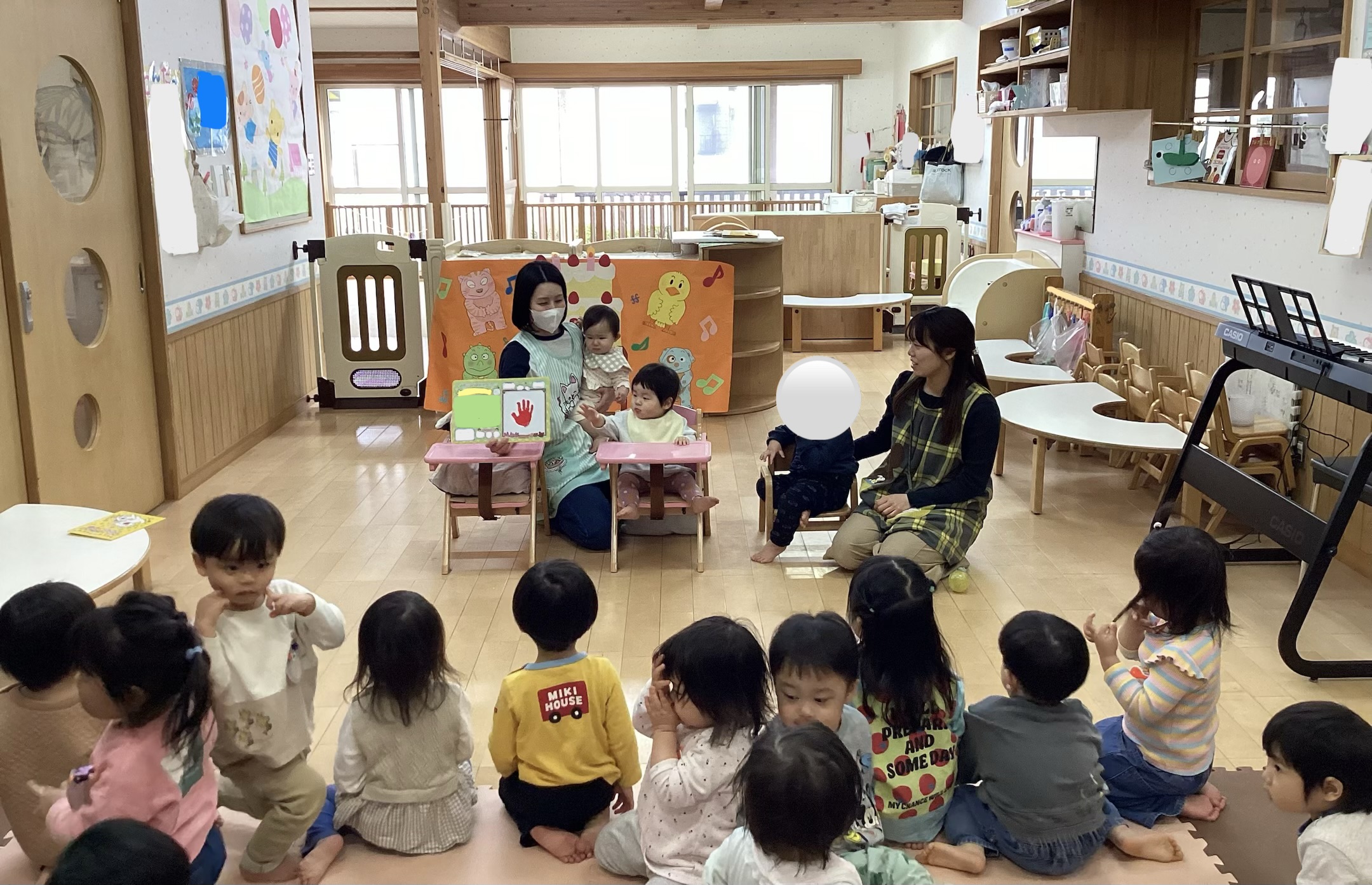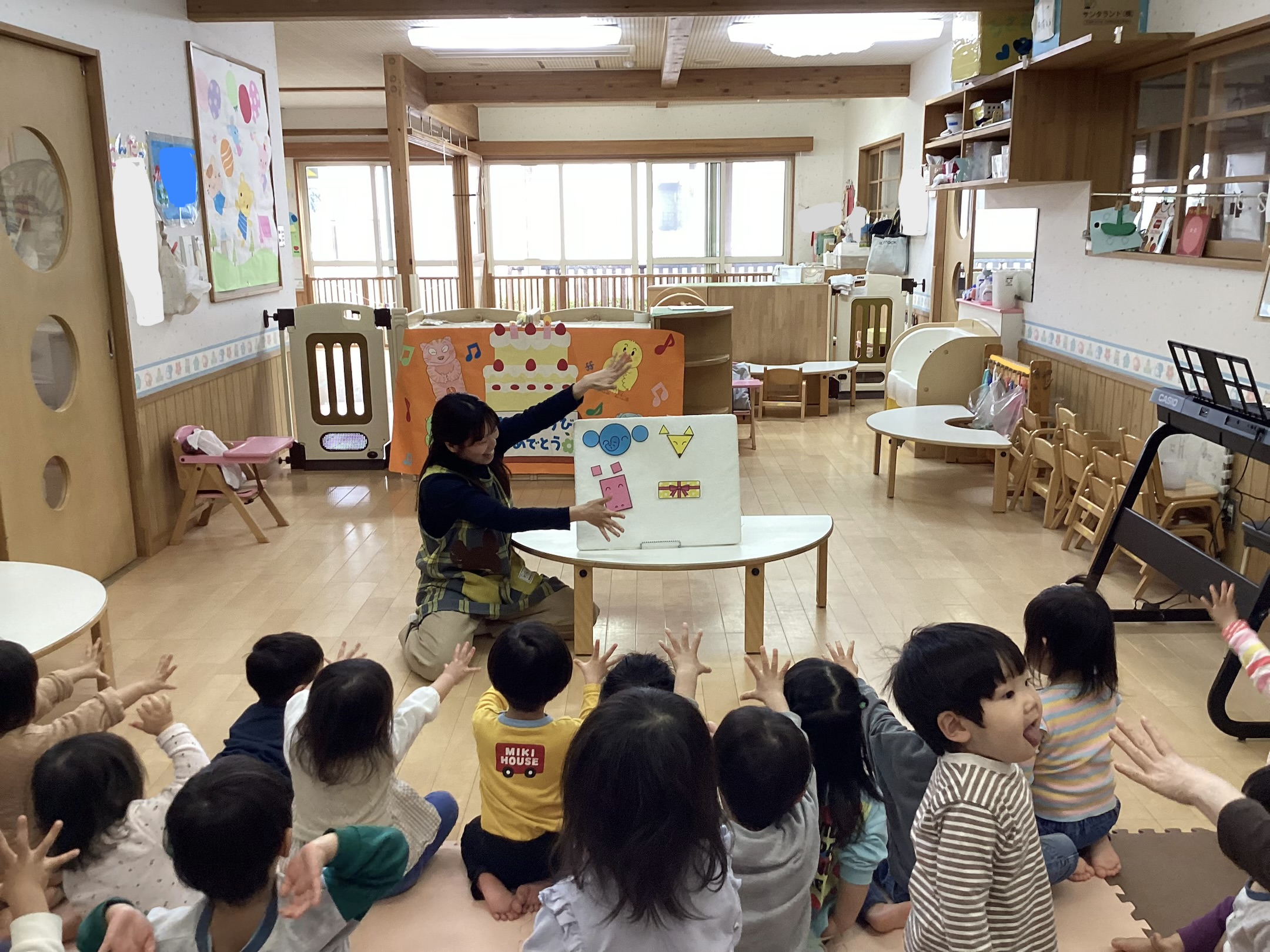 4月の誕生会 今年度初めての誕生会が行われました☺︎ 緊張しているお友だちもいましたが、カードのプレゼントを貰って嬉しそうな様子でしたよ♪ 先生からのお楽しみは、パネルシアター✨ 誕生日のお友だちへ動物さんからプレゼント!みんなで手を伸ばして「ひらけ〜!」とパワーをこめると、美味しそうなケーキが出てきました☺︎